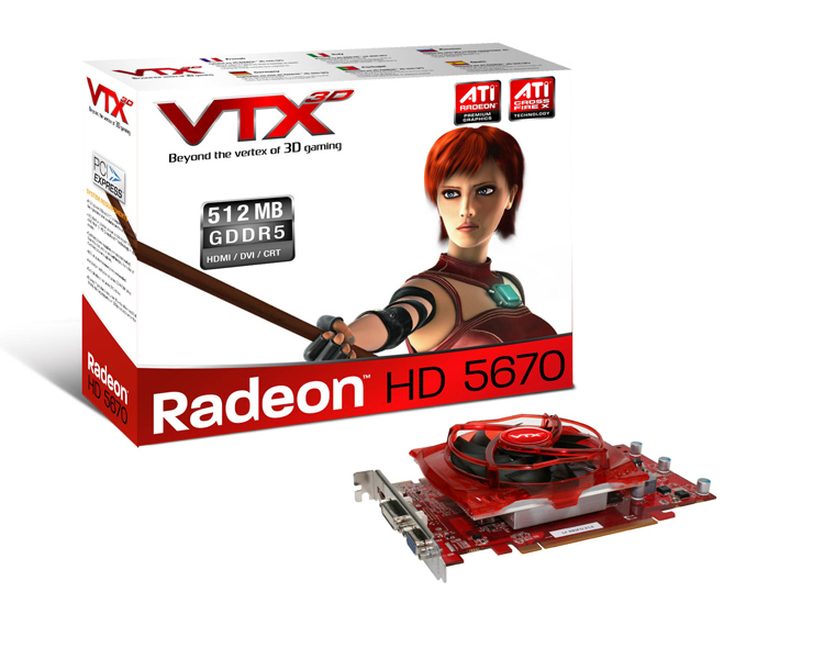 VTX3D HD 5670. Maximale Auflösung: 2560 x 1600 Pixel, Prozessor-Taktfrequenz: 775 MHz. Grafikkartenspeichertyp: GDDR5, Breite der Speicherschnittstelle: 128 Bit, Speichertaktfrequenz: 4000 MHz. Schnittstelle: PCI Express 2.1. Kühlung: Aktiv