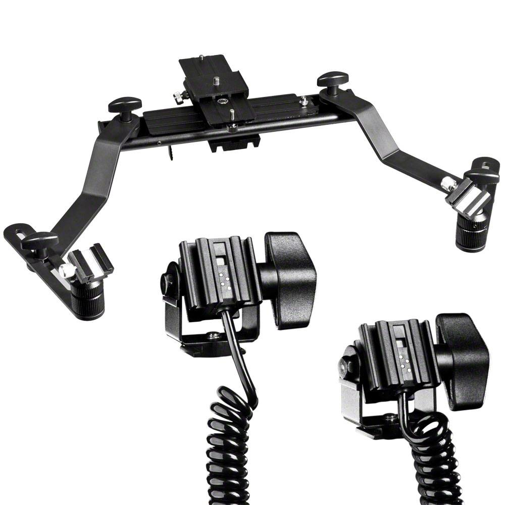 - Schienensystem aus Metall mit ¼“-Stativgewinde zum Montieren einer Kamera und zweier Systemblitze