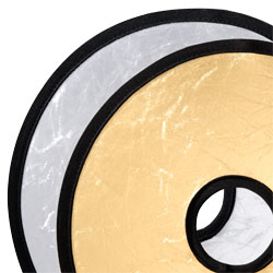 Der Objektivreflektor kann als Aufheller bei Fotoshootings genutzt werden. Dabei dient die goldene Beschichtung für eine warme Lichtstimmung und die silberne Beschichtung für eine kühle Lichtstimmung.
