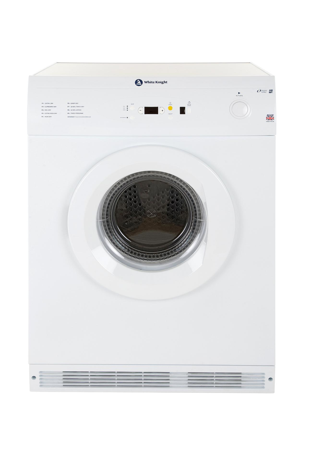 White Knight C86A7W. Bauform: Freistehend, Ladetyp: Frontlader, Trocknungssystem: Belüftet. Trommelkapazität: 7 kg, Zykluszeit: 180 min. Einschaltsverzögerung: 9 h. Energie-Effizienzklasse: C, Wärmequelle: Elektro. Breite: 596 mm, Tiefe: 530 mm, Höhe: 850 mm