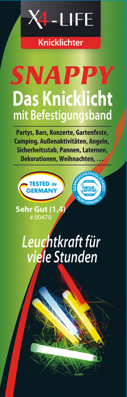 Gibt sicheres und zuverlässiges Licht unter allen Bedingungen. Für Notfälle zu Hause und unterwegs, zur Orientierung oder Markierung bei Stromausfall, Pannen und Unfällen. Die Snappys sind wetterfest und leuchten sogar unter Wasser. So sind sie ideal fürs Segeln, Angeln oder Camping geeignet. Als farbiger Spaß auf Gartenfesten, Konzerten sowie Sportveranstaltungen. Die Leuchtstäbe sind immer betriebsbereit – ohne Batterien! Durch das Prinzip des kalten Lichts benötigen Sie keinen Strom. Einfach knicken, schütteln und Sie haben viele Stunden Licht. Das Snappy Knicklicht ist in den Farben Rot, Blau, Gelb und Grün erhältlich.