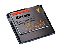 Xircom COMPACTCARD MODEM56. Modemgeschwindigkeit: 56 Kbit/s, Typ: Type II CompactFlash Card. Data Link Protokolle: V.90/56Kflex up to 56,000 bps V.34 up to 33,600 bps V.32terbo at 19,200 and 16,800 bps V.32bis at 14. Abmessungen (BxTxH): 41,4 x 42,8 x 5 mm