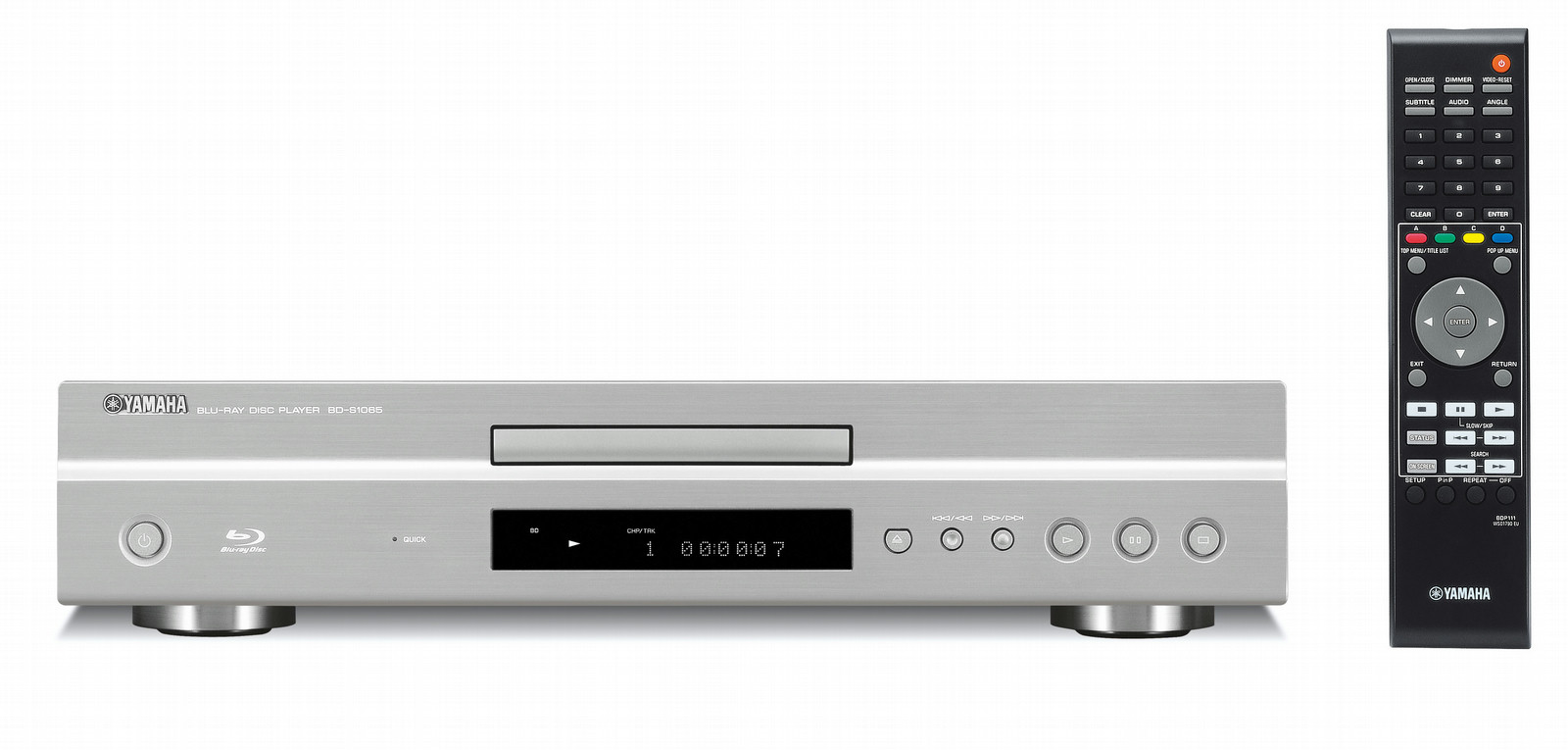 Yamaha BD-S1065. Produktfarbe: Titan. Unterstützte Medien: BD-R,BD-RE,CD. Seitenverhältnis: 16:9. Eingebaute Audio-Decoder: Dolby TrueHD,DTS-HD, Dynamikumfang (1 kHz): 100 dB, Signal-zu-Geräusche Verhältnis (SNR): 115 dB. Wiedergabeformate: BD Video, DVD-Video,DVD-VR AVCHD, CD-DA, JPEG
