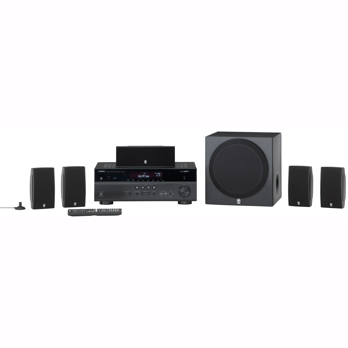 Yamaha YHT-597BL. Audio Kanäle: 5.1, RMS-Leistung: 400 W, Eingebaute Audio-Decoder: Dolby Digital Plus, Dolby TrueHD, DTS-HD, DTS-HD Master Audio. Unterstützte Bänder: AM, FM. Front Lautsprecher typ: 2-Wege, Front Lautsprecher RMS Leistung: 115 W, Front Lautsprecher Frequenzbandbreite: 20 - 20000 Hz. Center Lautsprecher typ: 2-Wege, Center Lautsprecher tweeter Größe: 5,08 cm (2 Zoll), Center Lautsprecher woofer Größe: 10,2 cm (4 Zoll). Satellite Lautsprecher type: 2-Wege