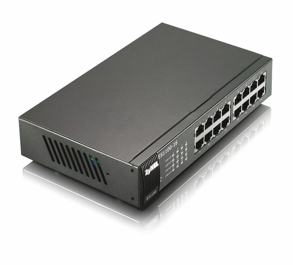 ZyXEL ES1100-16. Switch-Typ: Unmanaged network switch. Kupfer Ethernet Verkabelungstechnologie: 100BASE-T,10BASE-T. Netzstandard: IEEE 802.1p,IEEE 802.3,IEEE 802.3az,IEEE 802.3u,IEEE 802.3x. MAC-Adressentabelle: 8000 Eintragungen, Routing-/Switching-Kapazität: 3,2 Gbit/s, Datenrate: 10/100 Mbps. Produktfarbe: Schwarz, Sicherheit: EN 60950-1, IEC 60950-1, RoHS, Zertifizierung: FCC Part15 (Class A), CE EMC (Class A)