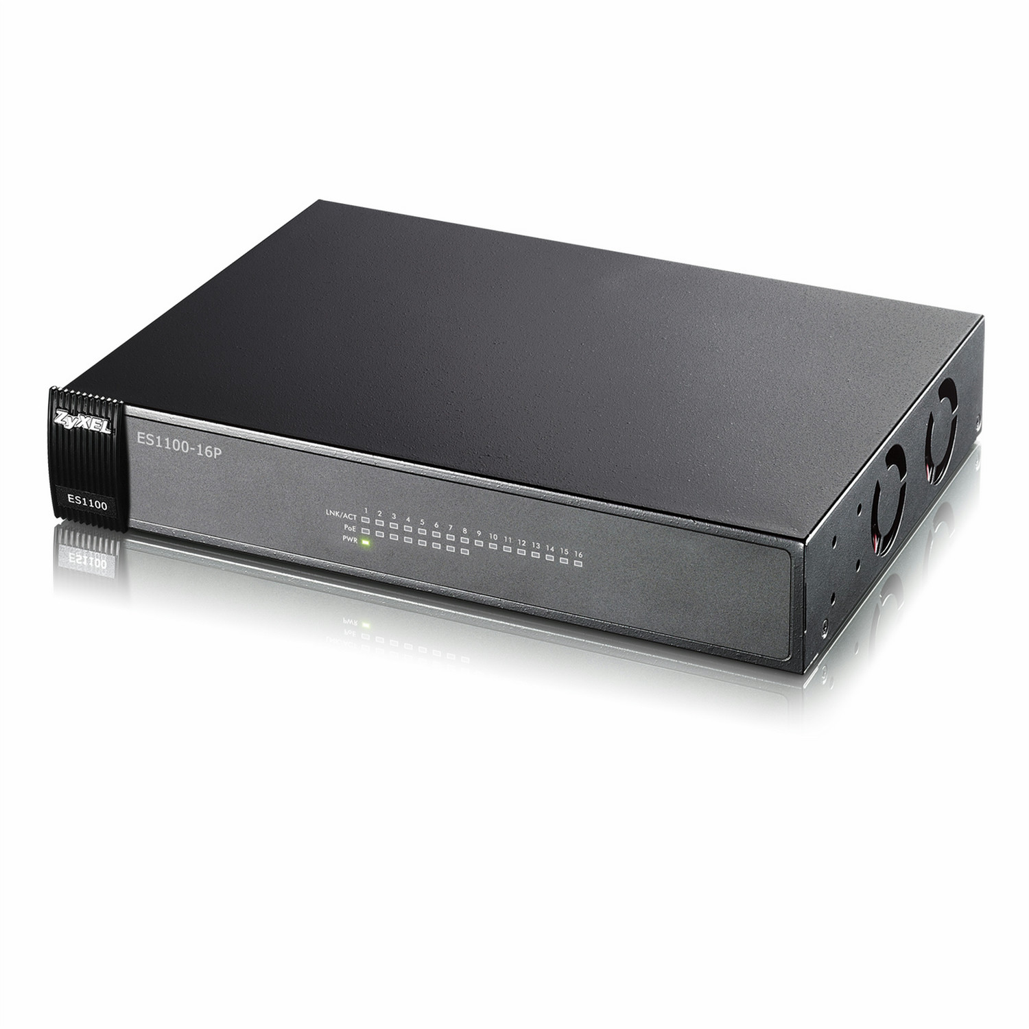 ZyXEL ES1100-16P. Switch-Typ: Unmanaged network switch. Kupfer Ethernet Verkabelungstechnologie: 100BASE-T,10BASE-T. Netzstandard: IEEE 802.1p,IEEE 802.3,IEEE 802.3af,IEEE 802.3az,IEEE 802.3u,IEEE 802.3x. MAC-Adressentabelle: 8000 Eintragungen, Routing-/Switching-Kapazität: 3,2 Gbit/s, Datenrate: 10/100 Mbps. Produktfarbe: Schwarz, Sicherheit: EN 60950-1, IEC 60950-1, RoHS, Zertifizierung: FCC Part15 (Class A), CE EMC (Class A)