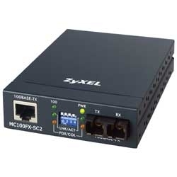 ZyXEL MC100FX-SC2 Media Converter. Datenübertragungsrate (Maximum): 100 Mbit/s. Maximal mögliche Übertragungsstrecke: 2000 m, Wellenlänge: 1310 nm. Sicherheit: UL, Cul, Zertifizierung: FCC Part15 (Class A) CE EMC (Class A) . Gewicht: 300 g. Abmessungen (BxTxH): 119 x 85 x 26 mm, Konformität mit Industriestandards: IEEE802.3 10BASE-T, IEEE802.3u 100BASE-TX, IEEE802.3x, Fibertyp: 62.5/125, 50/125 µm