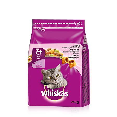 WHISKAS® 7+ Dry senior cat food is specially formulated with the right level of nutrients for your senior cat´s changing needs to keep her full of vitality. It contains tasty filled pocket kibbles she will love - crunchy on the outside with a soft and delicious centre.
