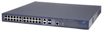 This model has 24 10/100 copper Ethernet ports and two "combo ports" which can operate as 10/100/1000 with a copper connection, or as 100 or 1000MB fiber connection using mini-GBIC SFP transceivers (transceiver ordered separately).