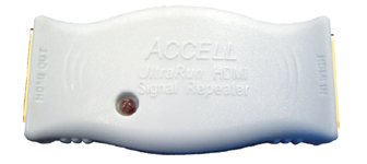 The Accell UltraRun High-Definition Multimedia Interface (HDMI) Signal Repeater supports up to a total of 164 feet (50 meters) of HDMI cable for extremely long cable runs. It equalizes and amplifies the digital signal, correcting the degradation that can occur over a long cable run, before outputting the signal to your display. Simply run up to 147 feet (45m) of HDMI cable from your DVD player or other video source to the UltraRun signal repeater. Then run up to 17 feet (5m) of HDMI cable from the repeater to your display. The UltraRun signal repeater supports up to 8 channel digital audio and up to 1080p high-resolution digital video. Its low-power design enables it to be powered directly from most HDMI sources, typically needing no external power.