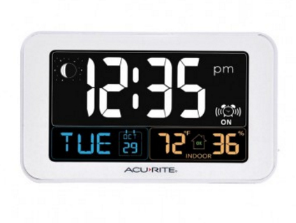 The AcuRite Intelli-Time Alarm Clock features an illuminated color display with indoor temperature (Fahrenheit or Celsius), indoor humidity, clock, date, day of the week, moon phase and alarm. The integrated USB port charges compatible smartphones with 1.5 amps of power. The clock’s alarm gradually increases in volume over a two minute time span to wake you up on-time and peacefully. Featuring AcuRite’s exclusive Intelli-Time technology, the clock comes pre-programmed with the correct time and date. It automatically updates itself for Daylight Saving Time and maintains time and alarm clock settings, even in the event of a power outage. Temperature and humidity can greatly affect quality of sleep. The clock displays the indoor temperature with a home comfort icon that easily indicates high, low or ideal humidity level conditions for your bedroom. One-year limited warranty. It's more than accurate, it's AcuRite.