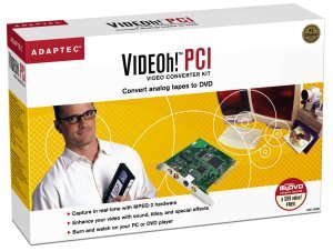 Adaptec® Video Converter PCI-Card Kit (VideOh!™ PCI) provides the easy way to convert analog camcorder video digitally then burn to DVD or CD discs with your PC. VideOh! PCI includes a PCI MPEG-2 capture card with A/V cable for simple connectivity to camcorders or other analog video device. It also includes Sonic™ MyDVD™ DVD- Video creation software for Windows®, which allows you to edit, author and burn video clips.