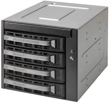 The Adaptec Storage Enclosure 335SAS is an internal hot-swap disk drive enclosure for up to four Serial Attached SCSI (SAS) or Serial ATA (SATA), or Serial ATA II (SATA II) hard disk drives. It occupies three half-height 5.25" slots in a server or workstation chassis and supports low profile 3.5" hard disk drives. Available in both beige and black, the Adaptec 335SAS supports drive data transfer rates up to 3 Gb/s while still supporting legacy 1.5 Gb/s SATA drives