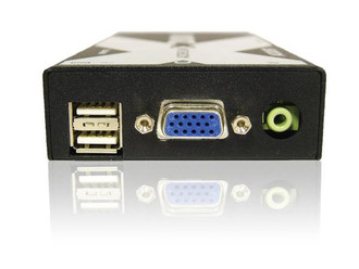 Fully featured USB keyboard, video and mouse extender with 44.1kHz digital stereo audio support for two computers.
