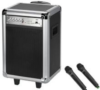 - Mobile Bluetooth sound system with a powerful battery for up to 36 hours of music playback, karaoke function, incl. 2 wireless microphones for unrestricted freedom of movement, incl. a USB port, card slot and AUX-IN, separate tone controls (bass, treble, main volume, microphone volume,echo effect)