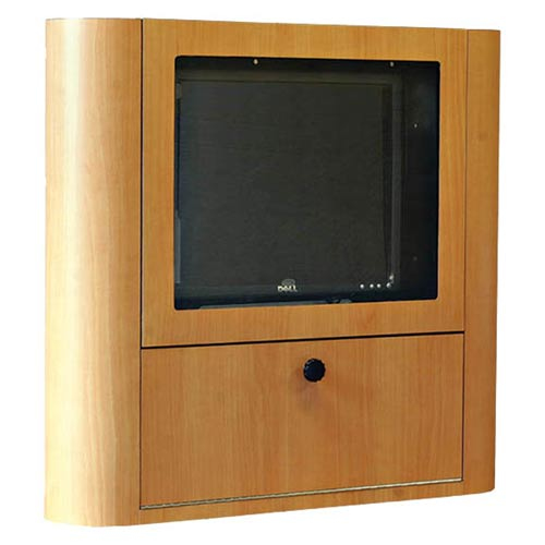 i-Center w/ Keyboard & Mouse Tray, Wild Cherry The wall mounts are available in attractive wood laminates that are luxurious in look and style. The Innovative, space saving data center is an attractive wall mounted information center that enables computer access wherever needed, without utilizing floor space. The Kiosk includes a fold-down keyboard tray with a damper for smooth operation and a VESA-compliant monitor holder. This data center accommodates any standard computer and turns empty wall space into a handy work area. The laminated front and side can be specified to match room decor, and mounts easily with grommet holes to allow cabling. It has a removable front panel with security screws to prevent theft. Wall mount Kiosk has a removable front panel with Plexiglas, On top of the kiosk is two grommet holes which ventilate and leads wiring into the cable management strips for organizing your wires. Inside our slip on monitor mount eases the mounting solution. The bottom unit has a foldable keyboard and mouse tray which can be locked for security. Wall unit measures 27"W x 25 -1/2" H x 6" D. The viewing window size is 16"W x 12 -1/2" H. Keyboard shelf depth: 8". Color featured is Wild Cherry These flexible Kiosk come in a variety of sizes, shapes, and colors options that accommodate virtually any location and workplace. Limited five year warranty except for electronics and motors which are covered for one year as are Lights and illuminators.