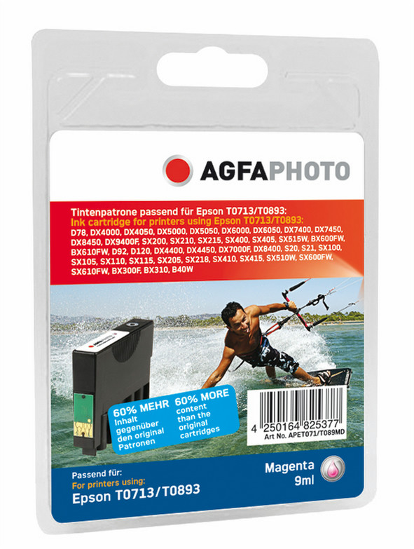 AgfaPhoto APET071T089MD. Cartridge capacity: Standard, Printing colours: Magenta, Compatible products: - Epson Stylus D 120 - Epson Stylus DX 8450 - Epson Stylus SX 205 - Epson Stylus D 78