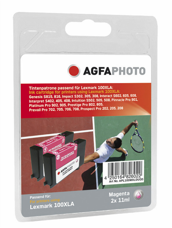 AgfaPhoto APL100MXLDUOD. Printing colours: Magenta, Compatible products: - Lexmark Genesis S 815 - Lexmark Intuition S 502 - Lexmark Prevail PRO 706, Package type: Blister