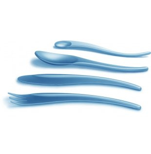 <b>Cutlery/flatware set composed of one spoon, one teaspoon, one knife, one fork in thermoplastic resin, blue.</b>