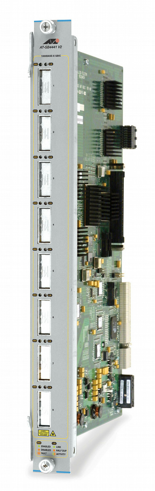 AT-SB4441A is a GBIC line card with 8 GBIC slots, and is ideal for Gigabit server connectivity. SwitchBlade line cards have ASC switch chips operating in Layer 3 mode and support for protocol-based VLANS and MAC address learning.