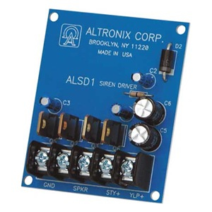 Model ALSD1 is a high output very low current draw dual channel siren driver designed to work with alarm panels with limited current capability.