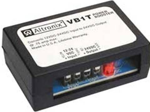 Model VB1T converts a 12VDC-24VDC input into a regulated 24VDC output.
