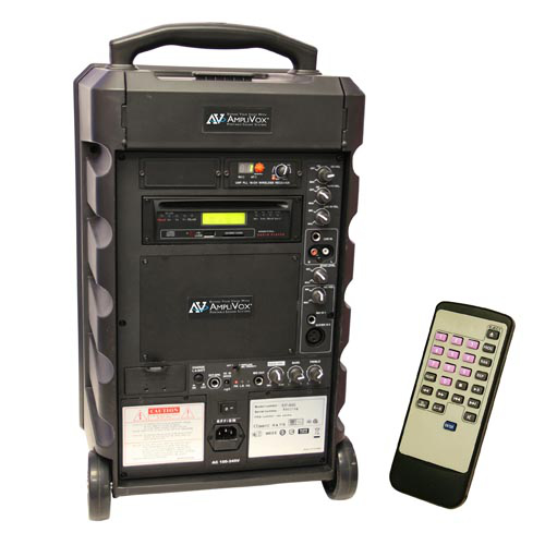 Equipped with a 100 watt amplifier, 8" speaker, built-in accessory storage and microphone battery recharger, the Titan Wireless PA comes ready for all your needs. Control your CD Player with variable pitch, SD Slot and USB input with Remote Control.