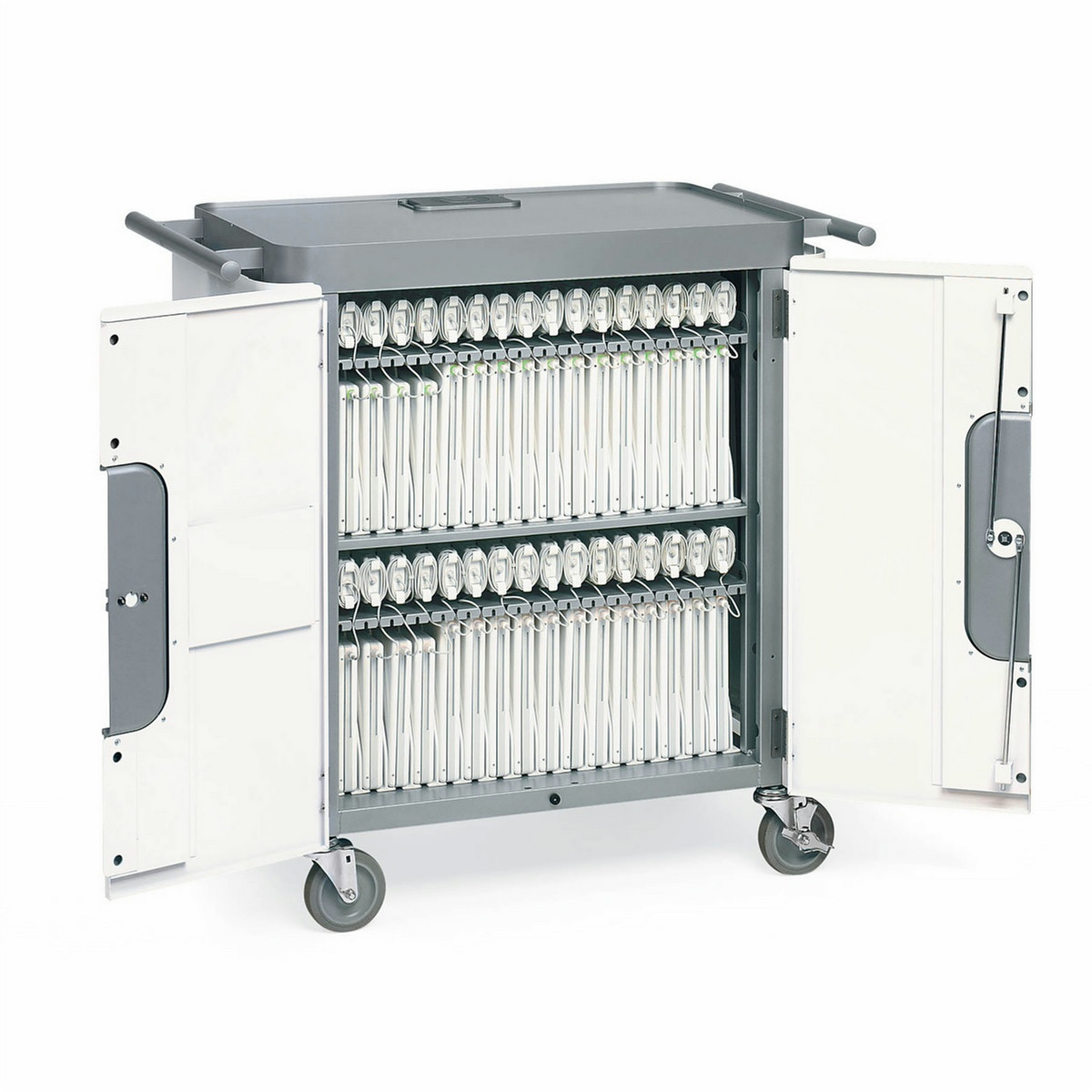 Each notebook cart makes transporting easy and safe. Multiple-point bolting doors and re-programmable padlock deters theft and helps ensure the security of thousands of dollars worth of equipment.