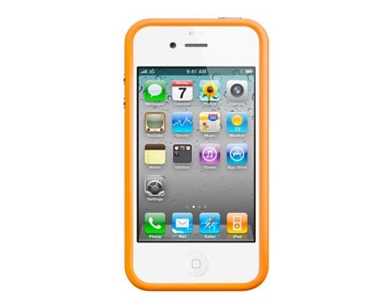 Dress up your iPhone 4 with an iPhone 4 Bumper. Choose one of six colors — white, black, blue, green, orange, or pink — and slip it around the edge of your iPhone 4. With metal buttons for volume and power, two-tone colors, and a combination of rubber and molded plastic, Bumpers add a touch of style to any iPhone 4.