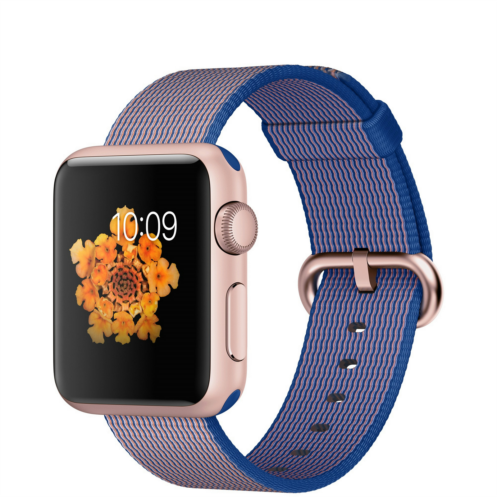 38mm, Retina display, Force Touch, S1, Wi-Fi, Bluetooth, watchOS 2, Rose Gold Aluminium Case, Royal Blue Woven Nylon Band You. At a glance.