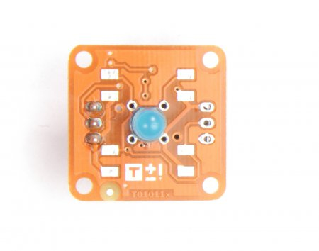 Module description: This module features a 5mm Blue Light Emitting Diode, the standard TinkerKit 3pin connector and a green LED that signals that the module is correctly powered and a tiny yellow LED that shows the current brightness of the blue LED. A resistor provides the optimal amount of current when connected to an Arduino.