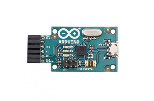 It features the Atmega16U2 programmed as a USB-to-serial converter, the same chip found on the Arduino Uno. The USB Serial module has an ISCP interface, allowing you to reprogram the chip when placed in DFU mode.
