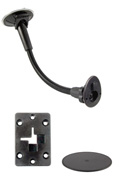 The 14" Long Windshield Pedestal is designed for use with vehicles such as trucks and vans in which the windshield is quite far back from the front of the dash. The suction on this pedestal is very strong and has a suggested weight capacity of up to 20 lbs. This pedestal installs without tools and can easily be transferred from vehicle to vehicle. The circular adhesive disc included allows you to mount to hard surfaces other than your windshield such as the car's dash or console. The AP012 adapter plate shown in the picture coverts the T-Tab pattern (used on XM radios) to the 4 hole AMPS pattern used on Sirius Satellite Radio receivers.