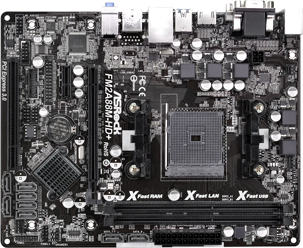 FM2+/FM2, AMD A88X, 2 x DDR3 DIMM, SATA3/USB 3.0/USB 2.0/D-Sub/DVI-D/HDMI/PS/2, 5.1 CH HD Audio, Gigabit Ethernet, PCI/PCI-E, Micro ATX