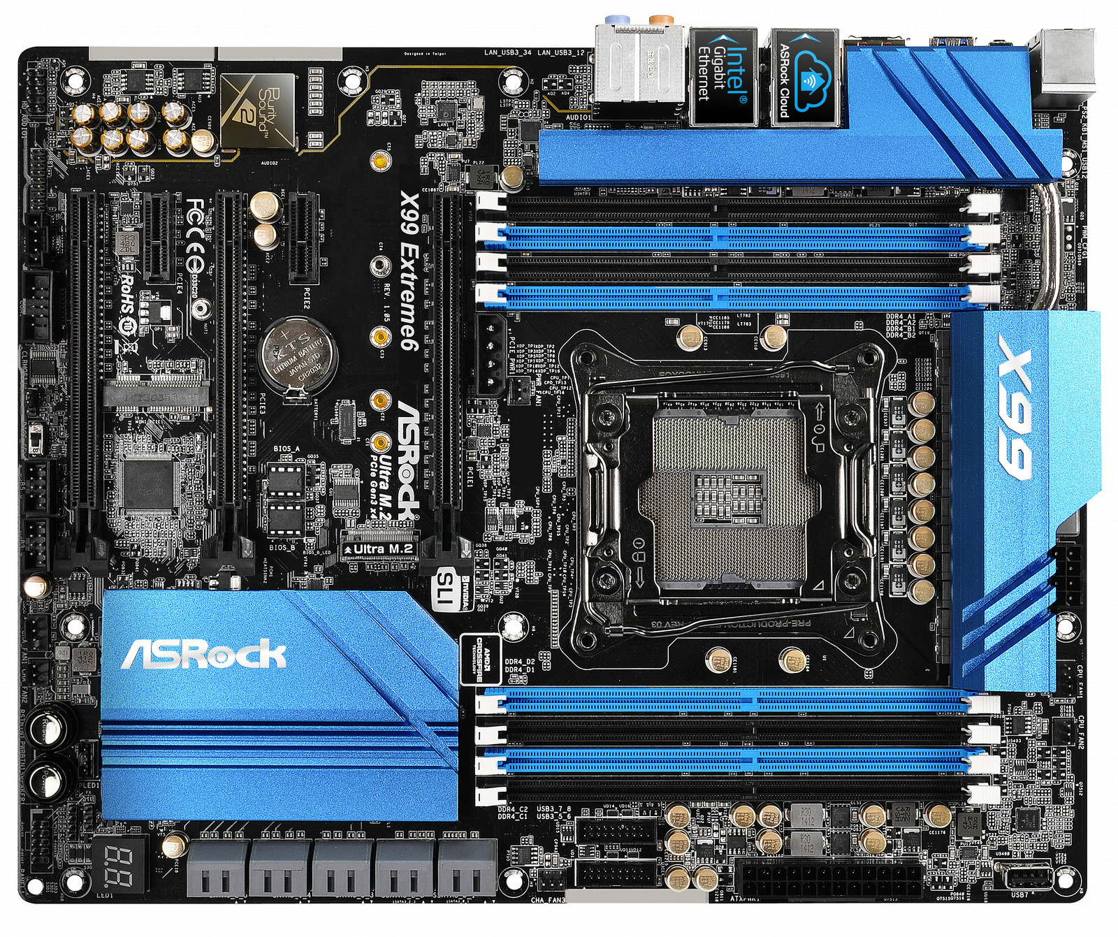Intel X99, LGA 2011, 8 x DDR4 DIMM, non-ECC, un-buffered, 3 x PCI Express 3.0 x16, 2 x PCI Express 2.0 x1, mini-PCI Express, PS/2, USB 2.0 x 2, ,USB 3.0 x 6, 2 x RJ-45, ATX