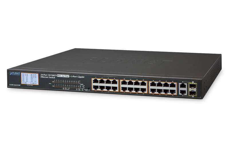 24-Port 10/100TX 802.3at combo PoE Switch 2-Port Gigabit TP/SFP, with LCD PoE Monitor, 300 Watts