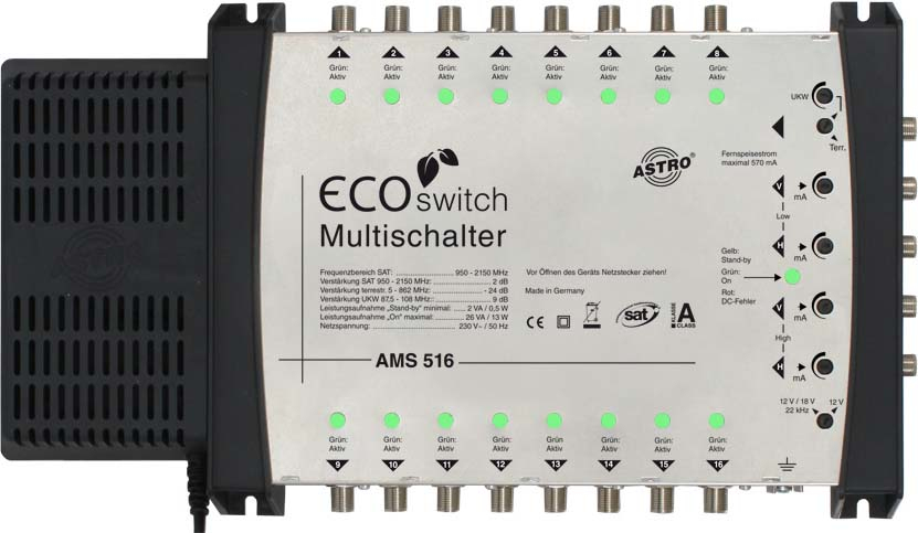 4 SAT inputs / 1 terrestrial input and 16 receiver-outputs with integrated energy saving power supply.