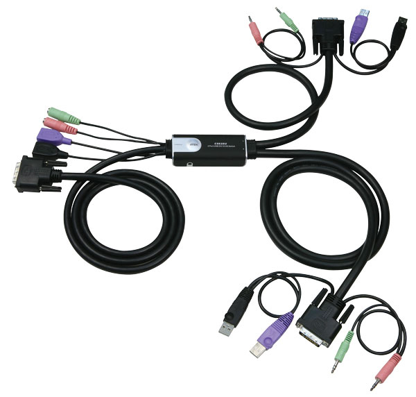 Start with DVI video which eliminates video distortions caused by the digital to analog conversion inherent with VGA; add 2.1 audio support for the full rich bass produced by a three speaker computer audio system. Top it off with a USB 2.0 port for sharing printers, scanners, external hard drives, etc. Drop the KVM on the floor behind your desk, place the button switch in any convenient location and you have an unbeatable solution to your cluttered desk top.