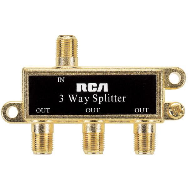 The RCA 3 Way Splitter allows for one coaxial video signal from a cable TV, VCR or antenna to be split to up to three separate channels, allowing for the same signal to be shared with a TV and DVD or VCR without being weakened. The RCA VH48N 3 Way Cable Splitter supports frequencies between 5MHz to 900MHz. With a corrosion-resistant connector, the RCA Video Splitter provides for a reliable and interference-free connection between your input and its split channels, giving you three consistent channels for one video signal.