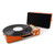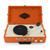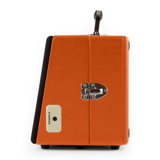 In addition to its technical strengths, the device impresses with its charming retro design and the portable construction. The compact wooden chassis is equipped with a stylish orange faux leather finish, while sturdy metal fasteners hold the two-piece construction together.
