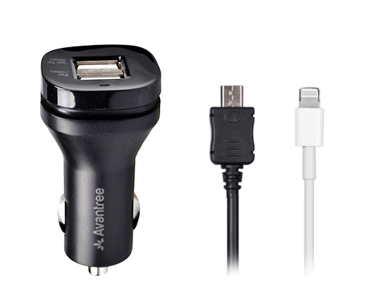 <b>Avantree CGST-14 car charger kit,</b> includes 1PCS dual usb charger, 1PCS Lightning to usb sync charge cable and 1PCS Micro USB sync charge cable.