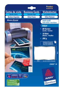 Avery C32035-10 . Width: 85 mm, Height: 54 mm. Media sheets per package: 8 sheets, Quantity per pack: 80 pc(s)