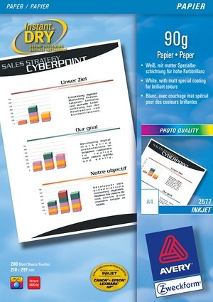 Avery Inkjet Photo-Paper Matt 90 g/m² 200 sheets. Media sheets per package: 200 sheets, Paper dimensions: 210 x 297 mm