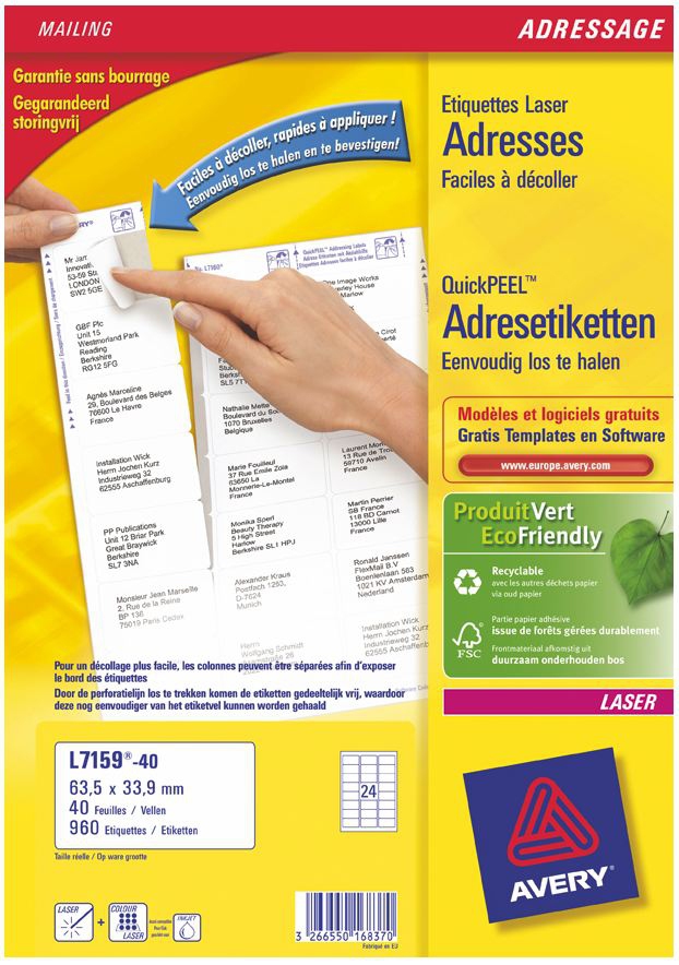 Avery L7159-40. Colour of product: White, Material: Paper, Print technology: Laser. Label size: 63.5 x 33.9. Media sheets per package: 40 sheets, Labels per pack: 960 pc(s). Media size (1 slide): A4