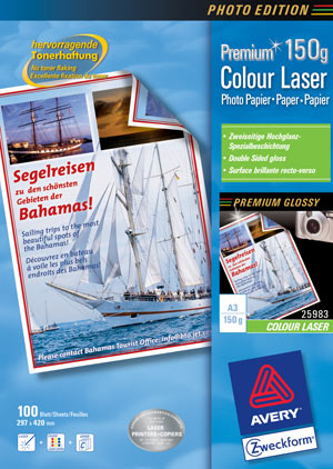 Avery Premium Colour Laser Photo A3 Paper 250 g/m². Colour of product: White, Media weight: 200 g/m². Media sheets per package: 100 sheets, Paper dimensions: 420 x 297 mm