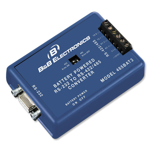 Model 485BAT3 features power versatility, making it perfect for field testing solutions. It converts unbalanced RS-232 signals to balanced RS-422 or RS-485 signals. RS-485 is an enhanced version of the RS-422 standard, allowing multiple drivers and receivers on a two-wire system.