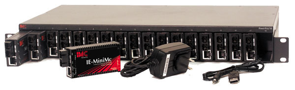 The IE-PowerTray/18-AC is a high-density mounting and powering chassis for MiniMc, MiniMc SFP, MiniMc-Gigabit, Giga-MiniMc, IE-MiniMc, IE-Giga-MiniMc and IE-ModeConverter SFP/SFP Media and Mode Converters. The IE-PowerTray/18-AC can be rack-mounted to a standard 19" equipment rack and features an internal AC power supply. Designed for extended temperature operation, the IE-PowerTray/18-AC is ideal for extreme environments.