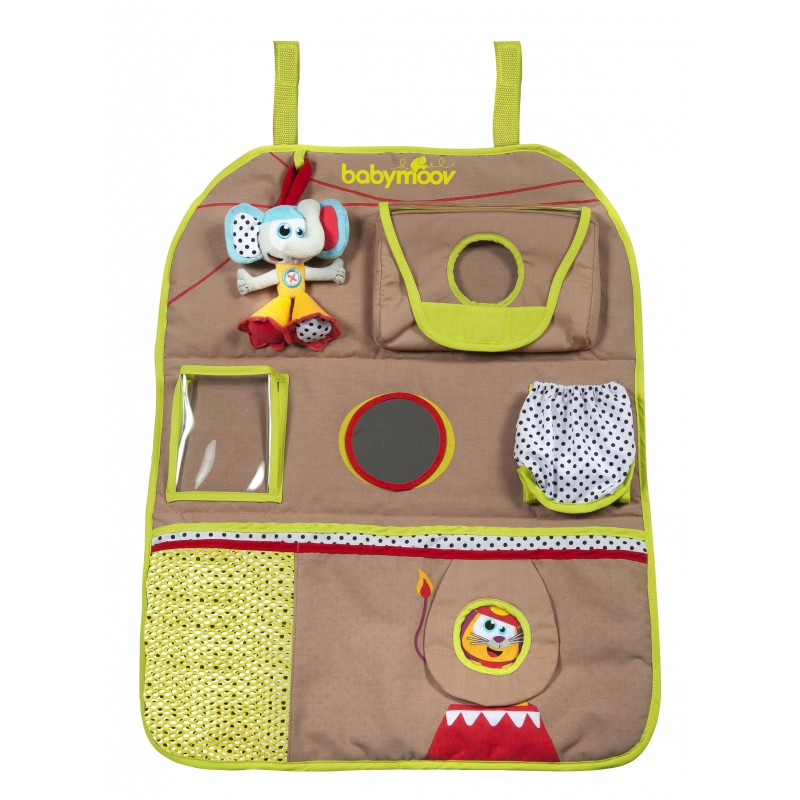 Convenient and stimulating for baby, the car organiser will allow you to classify and store baby's stuff during your journey. It comes with multiple storage pockets and with toys to stimulate baby such as a removable elephant, bells, crunchy paper, mirror...