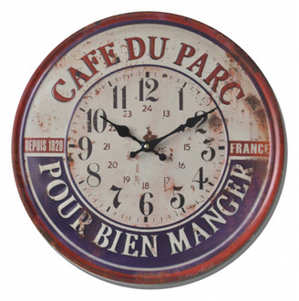 Colourful metal 40 cm diameter wall clock with analogue display.