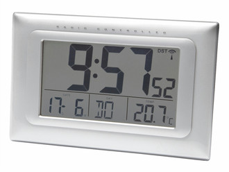 This radio-controlled clock can be used both as a wall clock as well as a table clock and features an extensive range of functions. In addition to the right time and a snooze alarm, the day, the date and the inside temperature are also displayed. The day display can be set in various languages.